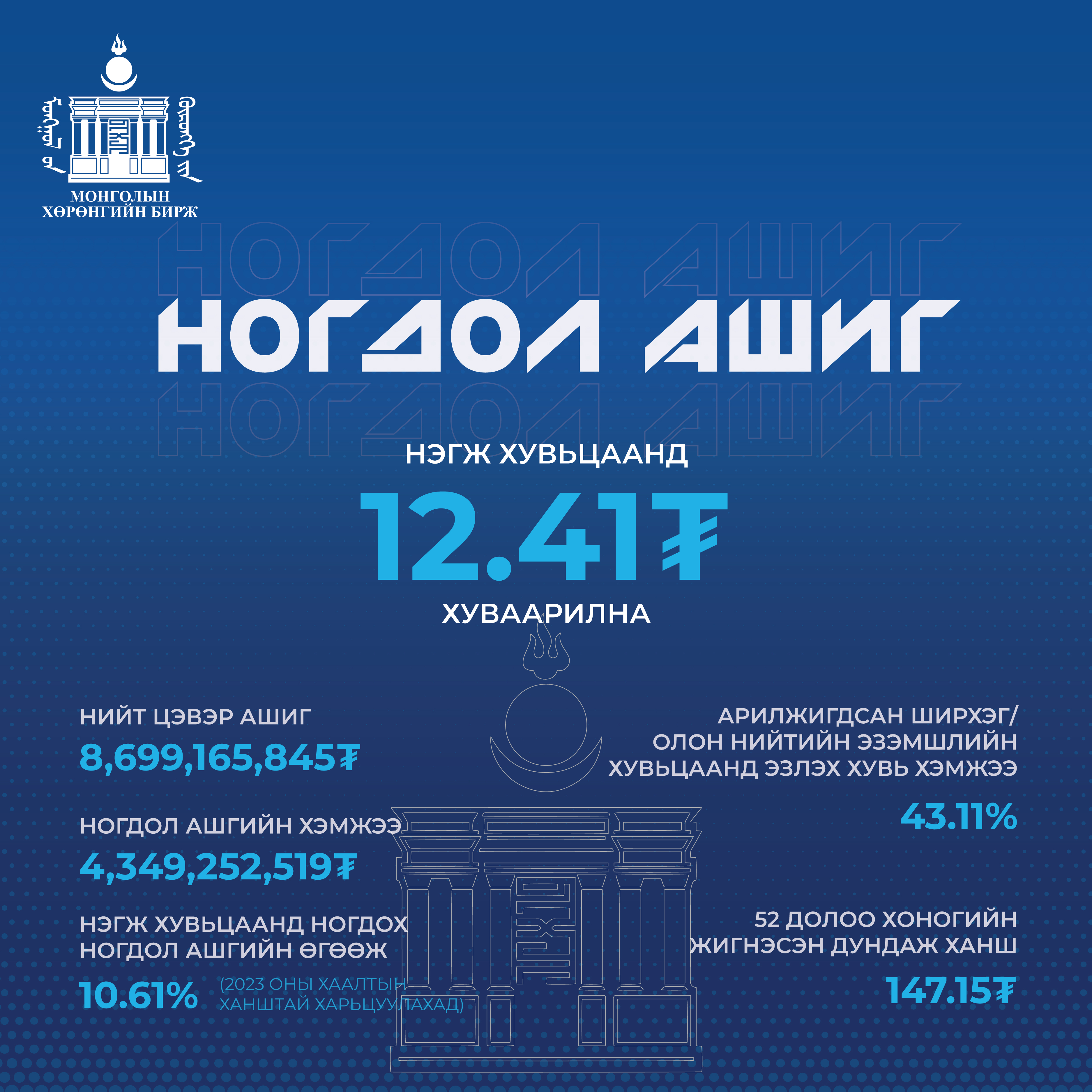 “Монголын хөрөнгийн бирж” ХК нь 2022 оны 12 сард IPO хийж, 34 хувиа олон нийтэд нээлттэй худалдан, хувьцаат компанийн хэлбэрт шилжсэн нь хөрөнгийн зах зээлд жишиг IPO болсон билээ. “Монголын хөрөнгийн бирж” ХК-ийн Төлөөлөн удирдах зөвлөлийн 2024 оны 02 дугаар сарын 16-ны өдрийн 08 дугаар тогтоолоор Компанийн 2023 оны жилийн эцсийн аудитын өмнөх санхүүгийн тайлангийн татварын дараах цэвэр ашиг болох 8,699,165,845 төгрөгөөс нийт 4,349,252,518.99 төгрөг буюу нэгж хувьцаанд 12 төгрөг 41 мөнгөөр тооцож ногдол ашиг хуваариллаа.