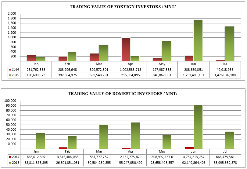 As of first half of June 2015, the trading participation of foreign investors has been increased by 2.5 times from the same period of the previous year and reached to MNT5.5 billion. On the other hand, domestic investors’ trading participation has been increased by 28 times and reached to MNT323.0 billion.