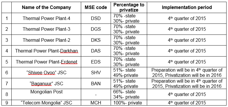 Here is the chart that shows state-owned companies that will be privatized at Mongolian Stock Exchange in 2015-2016.
