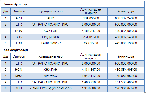 Хамгийн идэвхтэй арилжигдсан хувьцаат компаниуд дараах байдалтай байна.