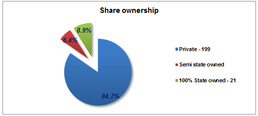 At the beginning of 2015, 238 joint stock companies listed at MSE, and based on resolution No.: 355 of 2014, resolution No.: 329 and 287 of 2015, “Khyalganat”, “Asia pacific properties” and “Mongolyn gegee” JSC’s shares delisted from MSE’ listing. Below shows MSE listed companies share ownership percentage: